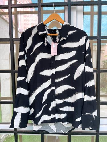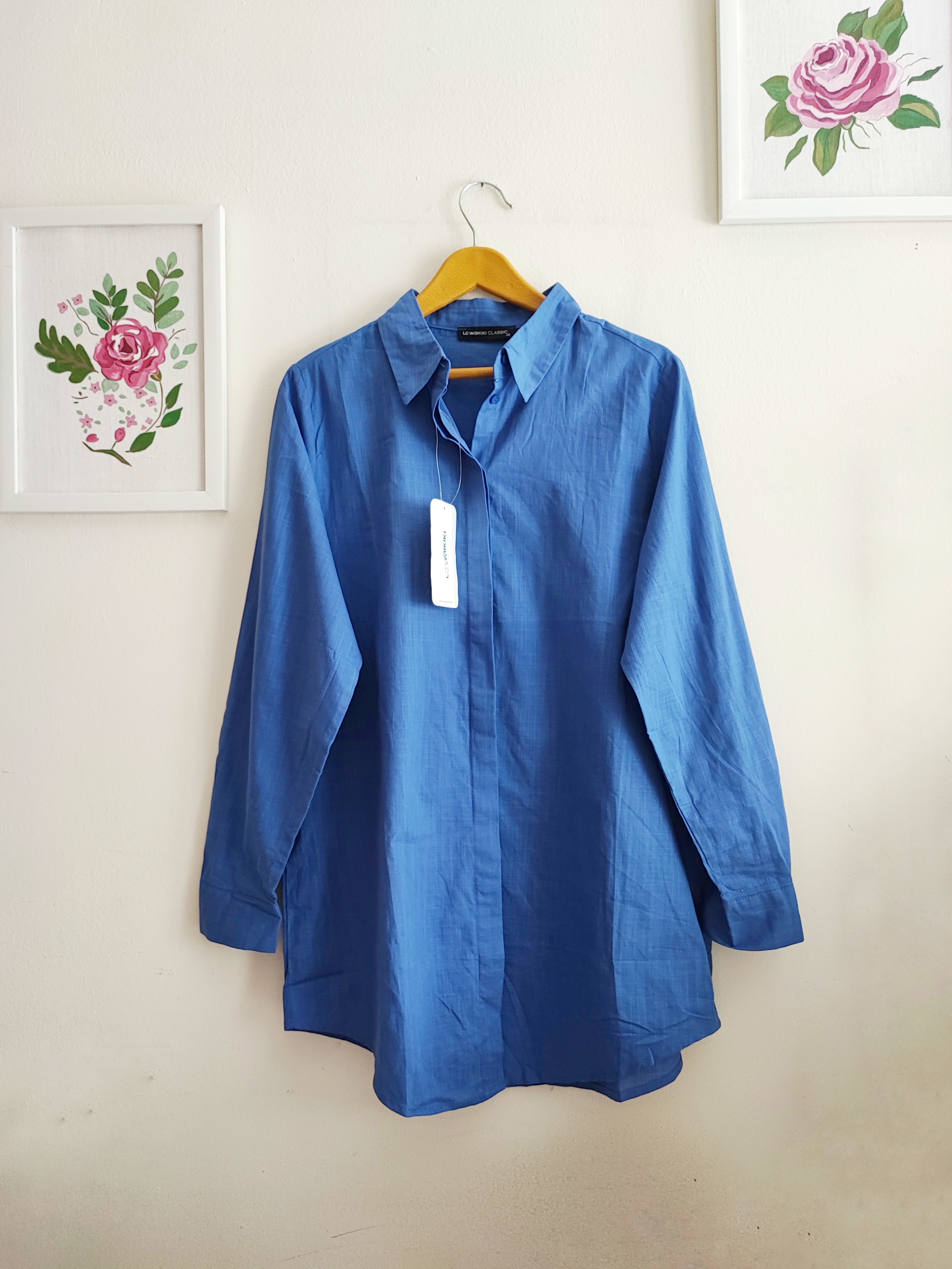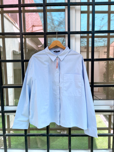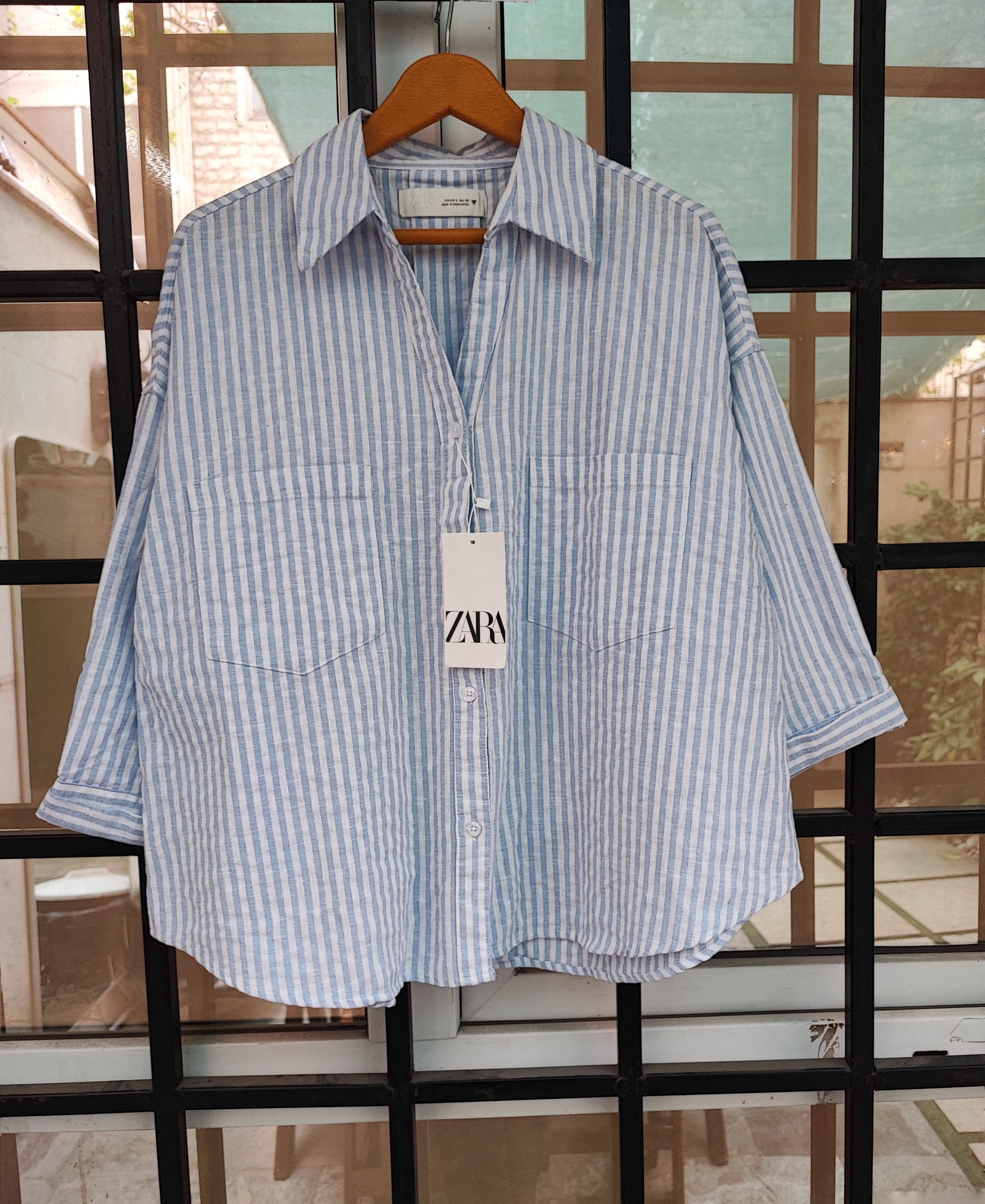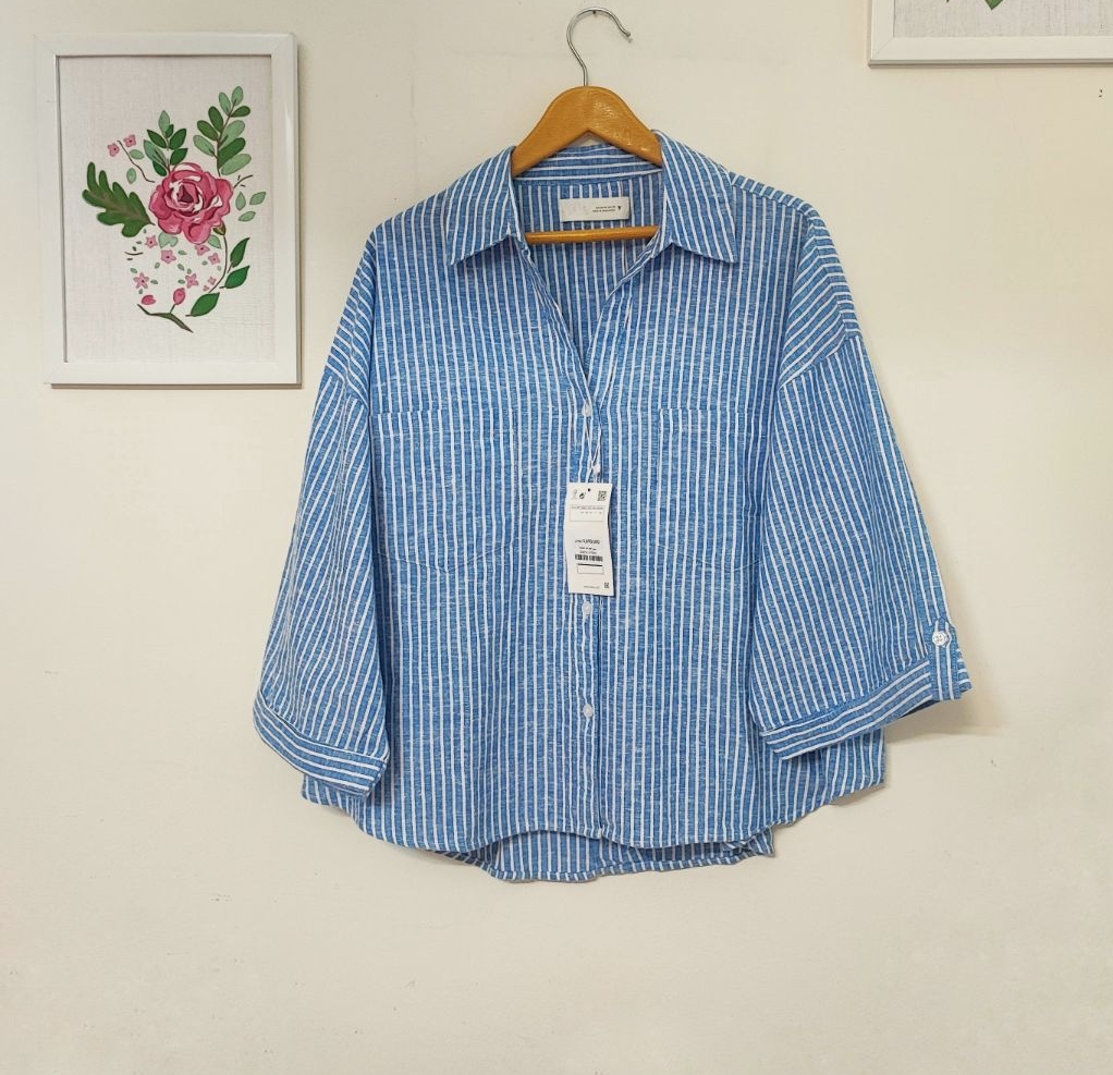 ناموجودشومیز لینن باکسی آبی راه راه برند زارا