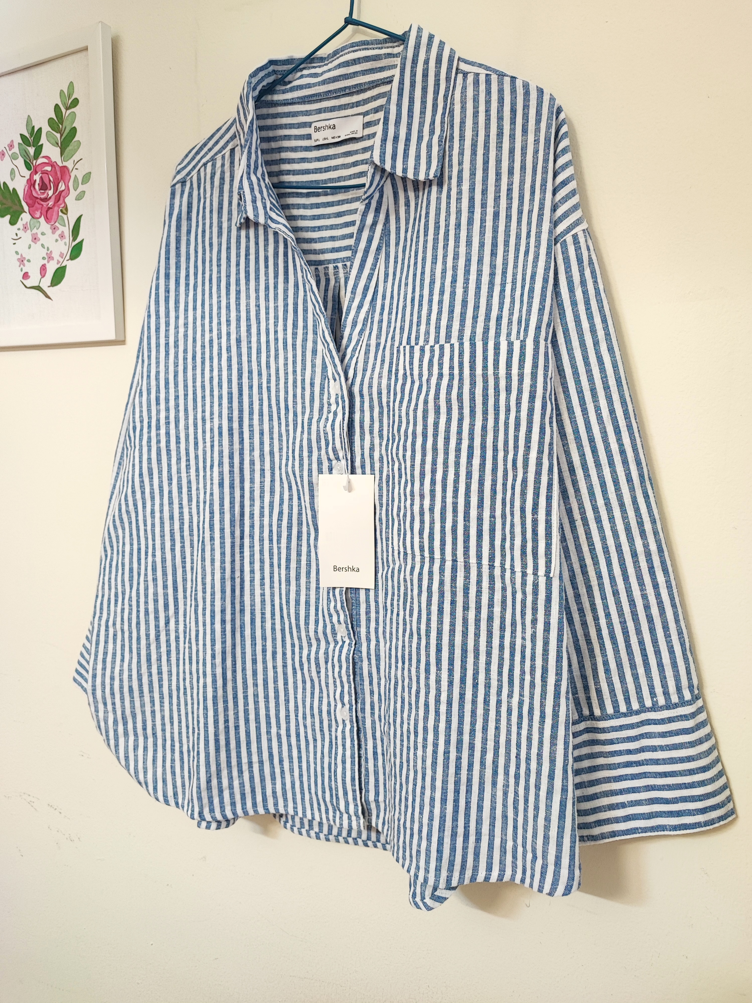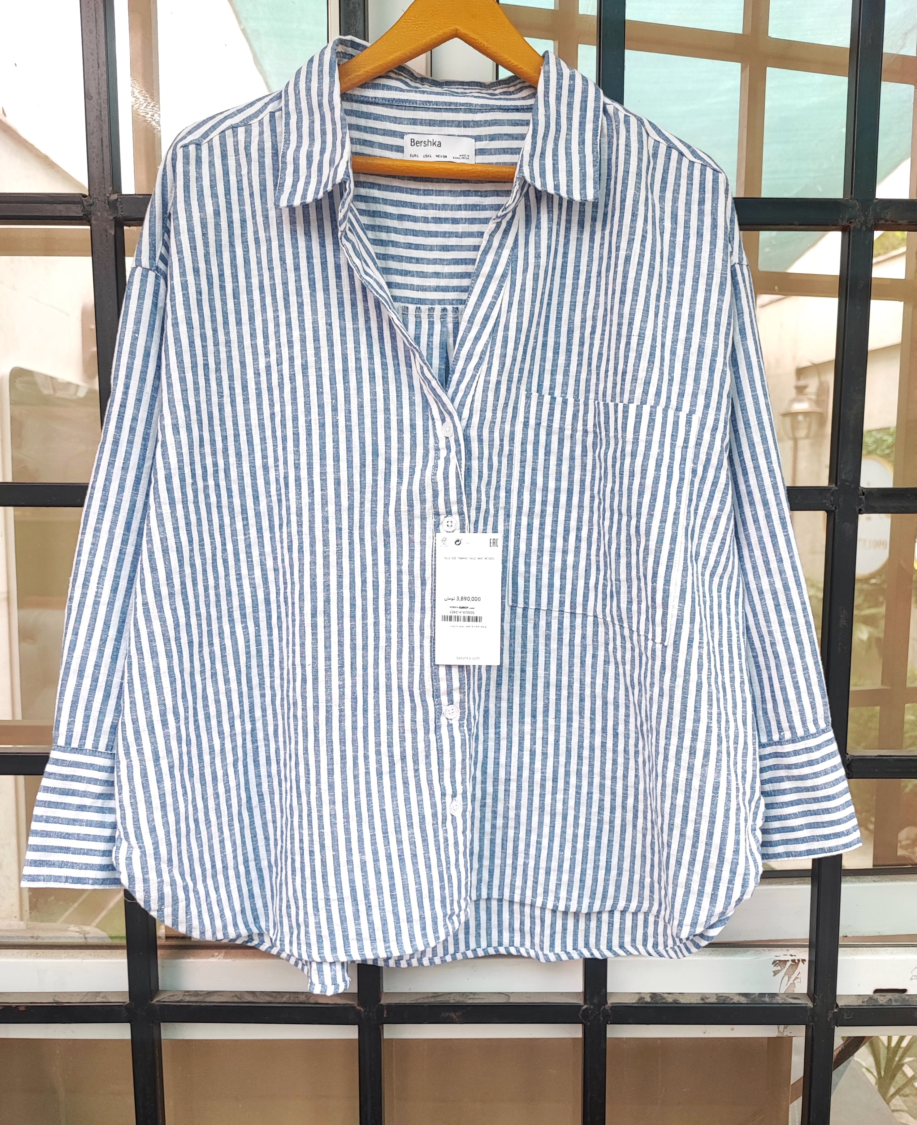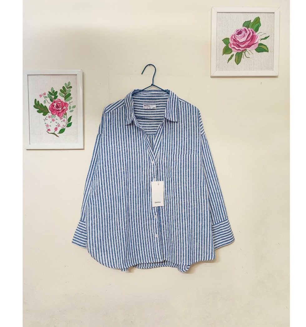 شومیز باکسی لینن وارداتی پترن آبی راه راه ترند و پرطرفدار برند برشکا فری سایز مناسب سایز ۳۸ تا ۴۶ بسیار با کیفیت و زیبا 👌🏻🩵
